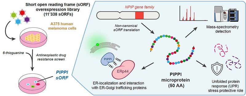 In our study, we used pooled overexpression screens using a curated library of over 11,000 sORFs and then performed phenotypic screens to discover microproteins that confer resistance to cancer cells undergoing selective pressure (in this case, treatment with nucleotide analogue 6-thioguanine). Did we find anything of note? Yes we did! Here, we describe PIPPI, a microprotein from the Morpheus gene cluster (criminally underrated, I mean, under-investigated locus despite evolutionary conservation) that localizes to and interacts with proteins in the endoplasmic reticulum to regulate ER stress response in cancer cells. Read more here
